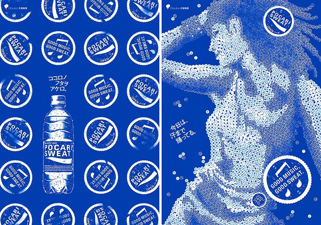 ポカリスエット×音楽フェスの夏プロモーションとして、フジロック、ROCK IN JAPAN FES、サマーソニックの際に展開するグラフィックポスターシリーズを制作しました。フェスの盛り上がりと、いい音楽で暑くなった体を潤すために飲まれるポカリスエットの数はきっと比例しているはず。次々とキャップが開けられると同時に解放されていく参加者のココロをイメージしながら、大量のボトルキャップ・アートで1度きりの青い夏の瞬間を切り取りました。
