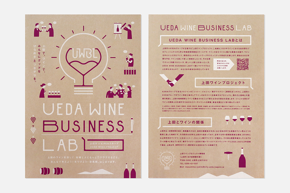 長野県上田市×KIRINグループが主催する「上田ワインプロジェクト」地域ビジネスやワインの各分野のプロフェッショナルから学ぶ現場密着型スクールのためのデザイン。シンボルとロゴを中心にグラフィカルな情報の整理を行っています。フライヤーはクラフト紙に白とボルドーレッドの特色印刷で仕上げました。